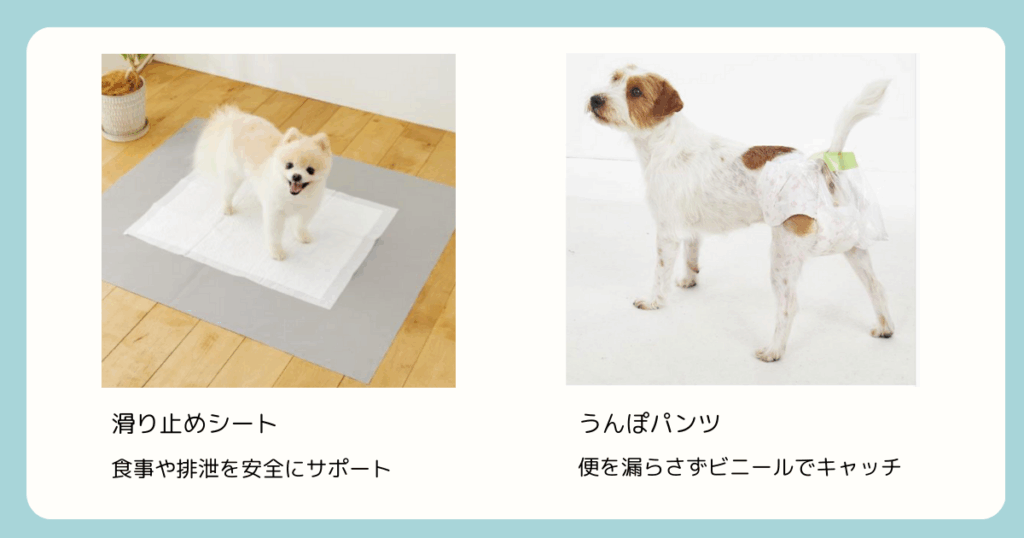 また、日中の散歩で適度な運動することも大切です。高齢になると足腰が弱り散歩の時間が短くなることがあります。筋力の低下予防のためにも、完全に寝たきりになる前に腰を支えるハーネスや車椅子の導入などを検討すると、散歩による楽しみというペット自身の尊厳を守ることにも繋がります。歩行の補助として滑り止め靴下やトーグリップスの導入も有効です。それでもうまく歩くことができない場合は、カートに乗せてお散歩するというのも一つです。