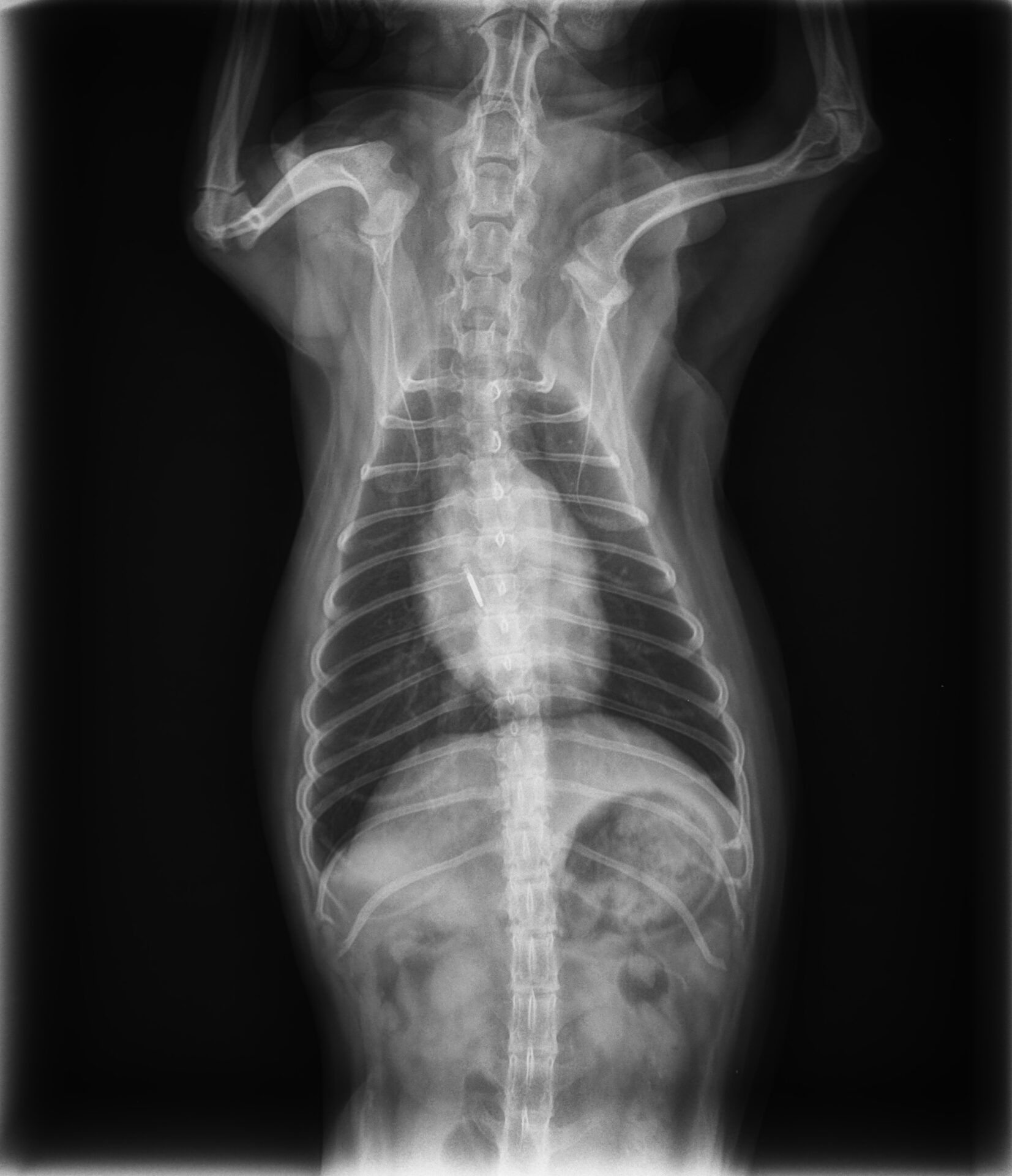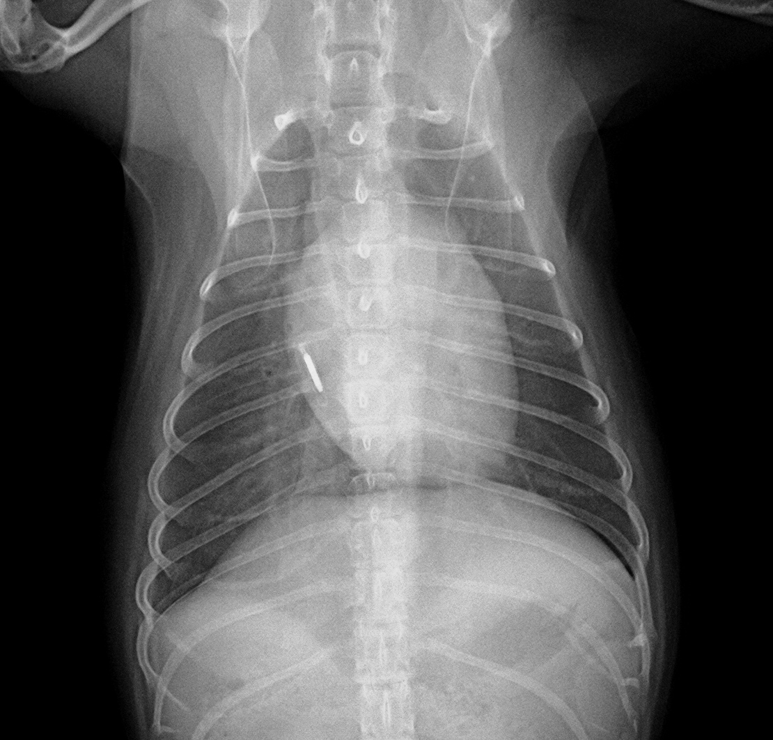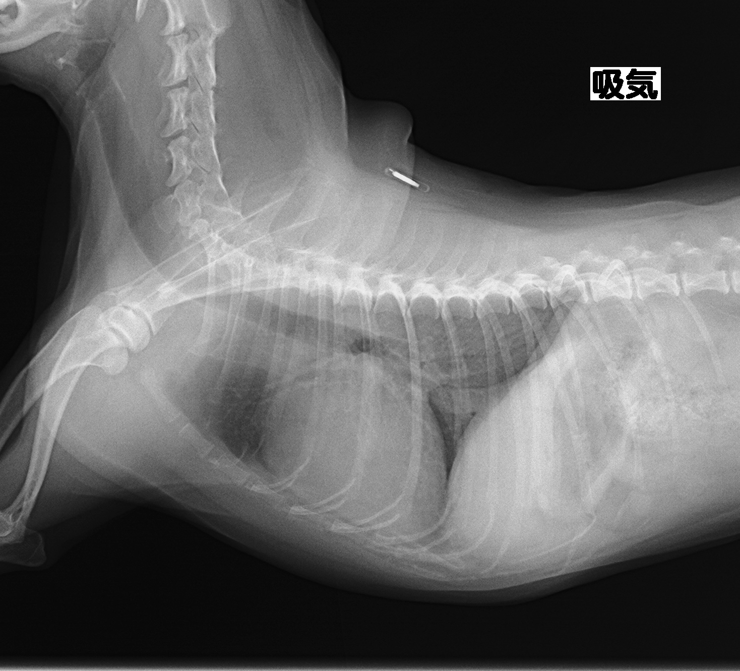 画像は前述の写真と同じ子の別時期のものです。肺に水がたまり(肺水腫)肺が白く写っています。息苦しさに気づき来院されました。